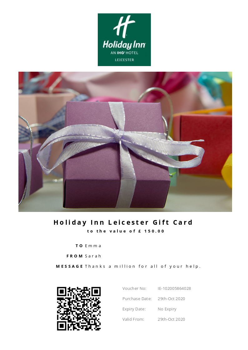 Holiday Inn Leicester allows you to purchase instantly printable gift vouchers, special offers and tickets using the Voucher Connect platform.